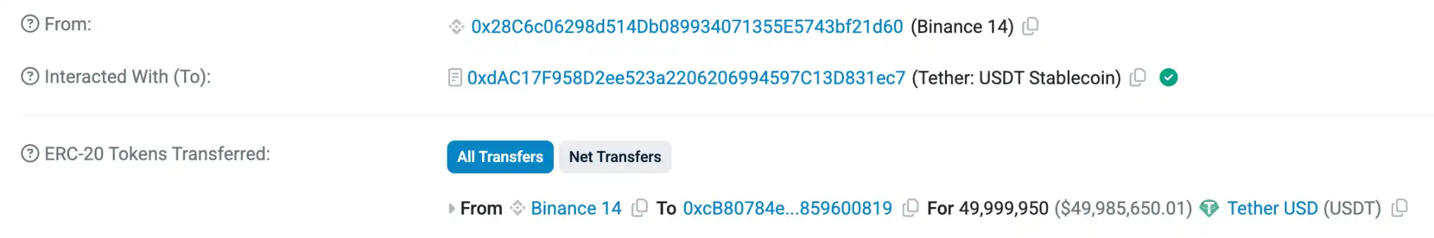 大约 10 小时之后,该地址从 Binance 一次性提出了 49,999,950 枚 USDT,加上之前提出的 50 USDT,总计正好 5000 万。