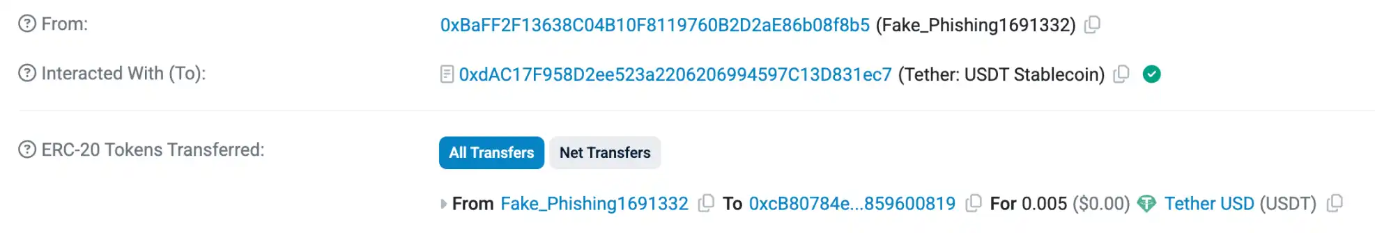 就在测试转账完成后的不到 15 分钟时间,黑客地址 0xbaff…08f8b5,就向剩下 49,999,950 枚 USDT 的地址转入 0.005 枚 USDT。黑客使用的地址与接收 50 枚 USDT 的地址开头结尾都很相似,是一次明显的「地址投毒」攻击。