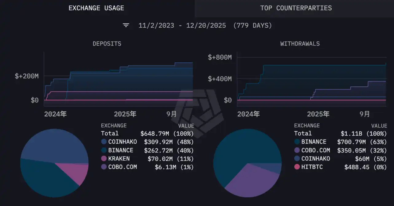据 Arkham 平台整理的数据,该地址与 Binance、Kraken、Coinhako、Cobo 地址均有大额转账记录。Binance、Kraken 和 Cobo 无需介绍,而 Coinhako 可能是一个相对陌生的名字。Coinhako 是一家成立于 2014 年的新加坡本地加密货币交易平台,于 2022 年获得新加坡金融管理局颁发的大型支付机构牌照,属于新加坡受监管的交易平台。