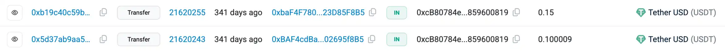 大约 20 分钟之后,收到 5000 万枚 USDT 的地址就先向 0xbaf4…95F8b5 转入 50 枚 USDT 用于测试。