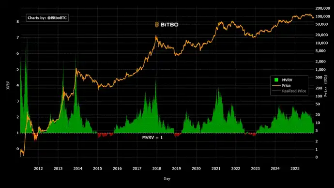 而当前 (2025 年 Q4),Puell Multiple 处于 1~2 区间,显示矿工压力适中。