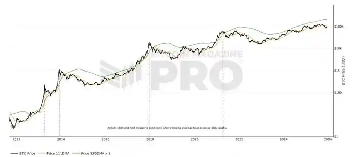历史上,Pi Cycle Top Indicator 在每轮牛市顶部前都有交叉表现: