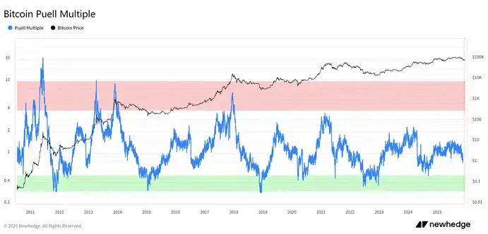 Puell Multiple 衡量矿工每日收入相对于 365 日移动平均线的比率,用于评估矿工盈利水平和市场周期。
