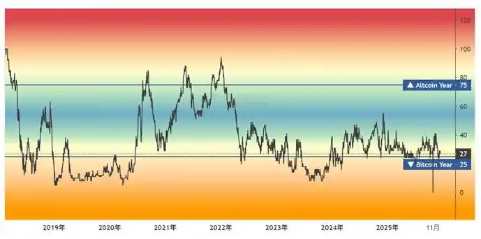而当前 (2025 年 Q4),指数处于 30~40 区间,山寨板块表现低迷。其实本轮 BTC 牛市以来,该指标最高都没有触及 60,这可能是因为流动性不足以及过多增发的新币造成的。