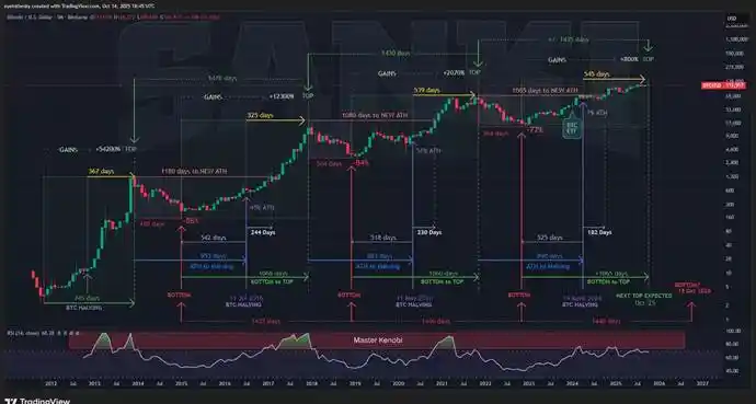 STH 激增,但如今这些指标的表现却十分温和。这并非说明当前比特币价格尚未见顶,这些指标均是以空间作为判断依据的,而下面这张以 3 年时间周期来预判币价顶部的示意图,似乎说明比特币已经见顶。