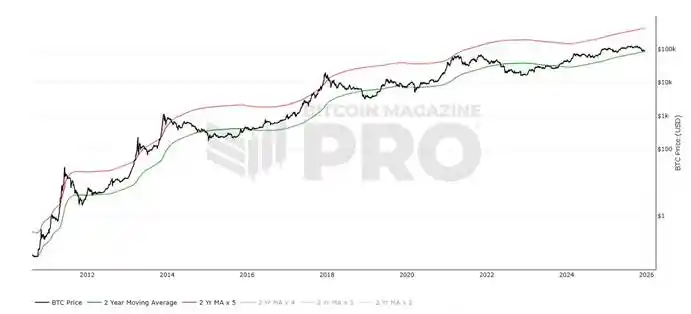 历史上,2-Year MA Multiplier 在每轮牛市顶部前都有极端倍数的表现: