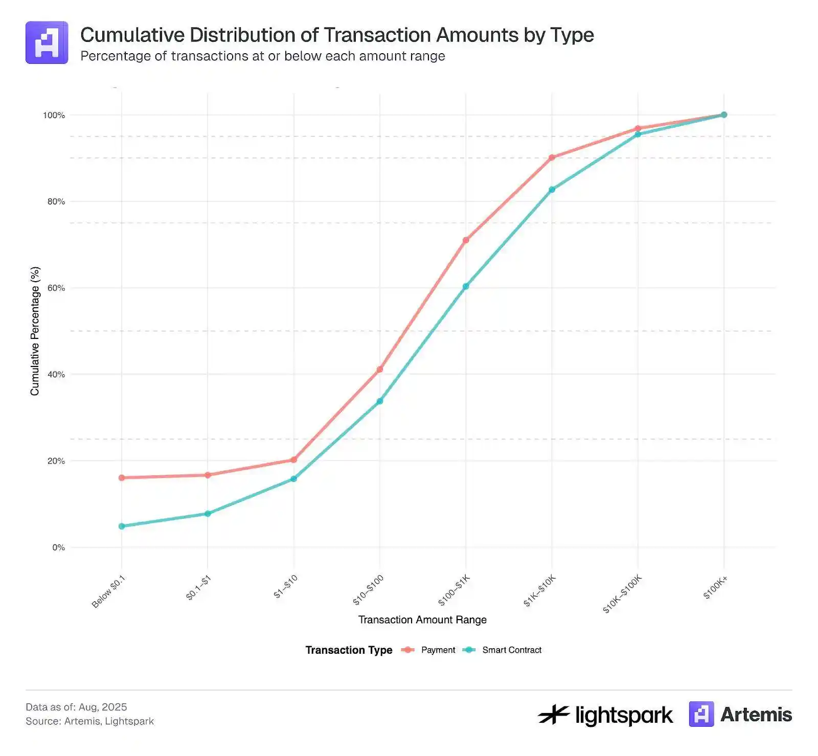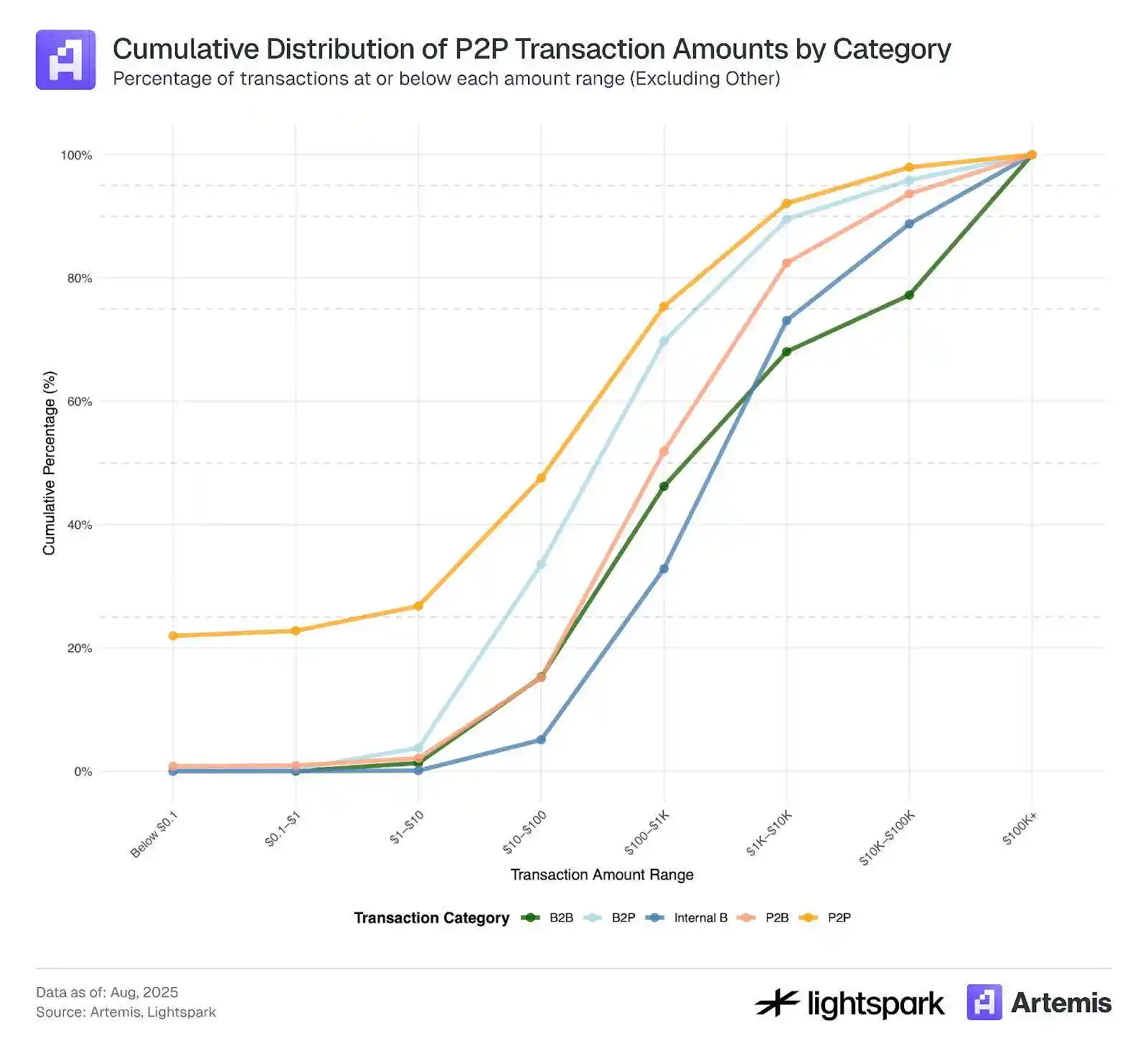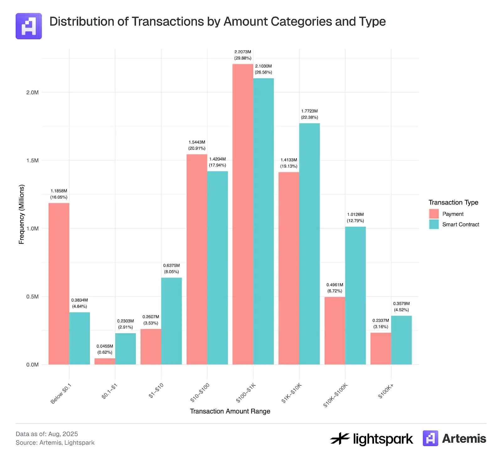 显而易见,稳定币的采用率正在随着时间不断提高,其交易量和交易次数在 2024 年 8 月至 2025 年 8 月期间翻了一倍以上。估算稳定币在支付中的使用情况是一项具有挑战性的任务,越来越多的工具正在被开发以帮助改进这一估算。本研究利用 Artemis 提供的标签数据,探讨并估算了记录在区块链(以太坊)上的稳定币支付使用情况。