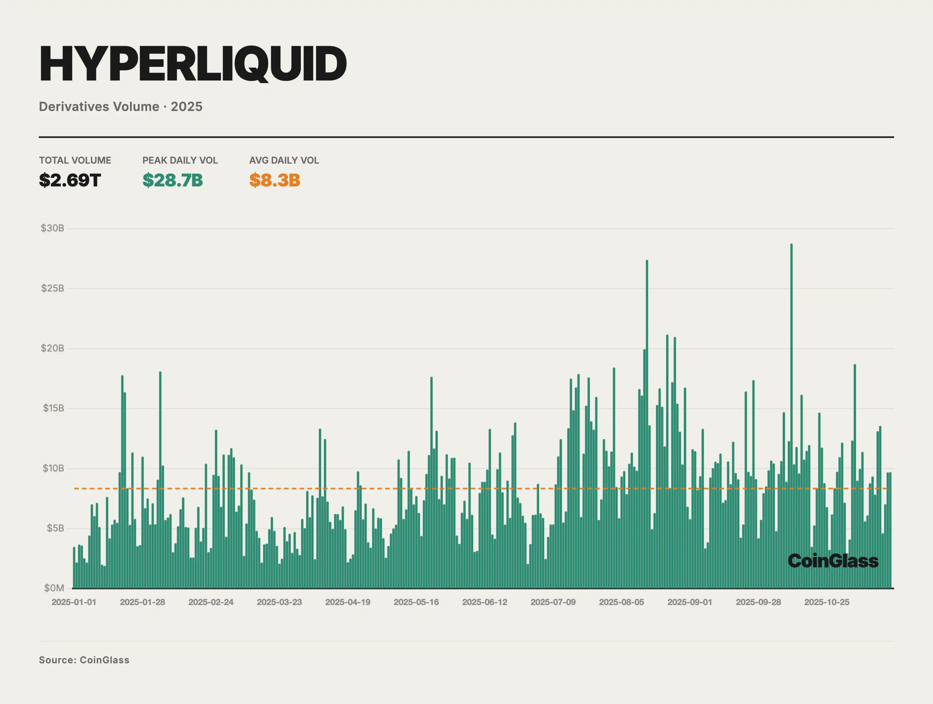 2025 年,加密衍生品市场总成交量约 85.70 万亿美元,日均成交约 2,645 亿美元。在宏观流动性环境依旧偏紧、风险偏好阶段性修复的背景下,全年成交活跃度整体呈「先低后高、震荡抬升」的结构。目前,衍生品已经成为绝大部分主流资产价格形成与风险管理的主要场所。图中橙色虚线所示的均值上方反复出现放量交易日,其中 10 月 10 日单日峰值约 7480 亿美元,显著高于年内常态水平,反映出在行情加速阶段,衍生品已成为价格发现与杠杆博弈的核心战场。月度维度看,一季度日均成交额多在 2000 亿美元,二季度起逐步走高,7–8 月及 10 月的日均水平抬升至 3000 亿美元以上。