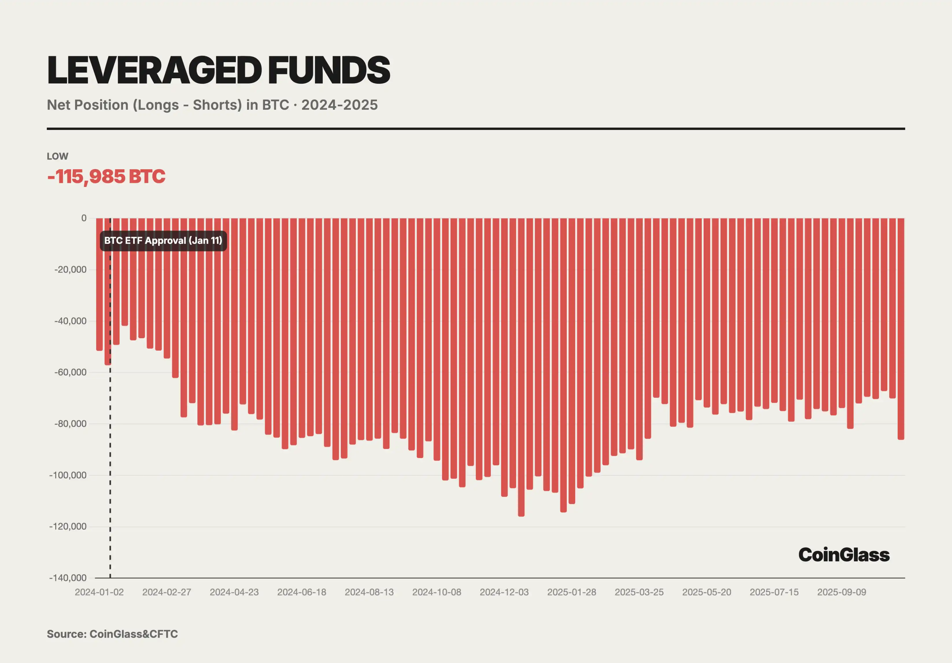 目前杠杆基金持有的净空头头寸高达 1.4 万张合约。深入分析表明,这实际上是基差交易(Basis Trade)的直接产物。杠杆基金在现货市场或通过 ETF 买入 BTC,同时在 CME 卖出等量的期货合约。这一组合是 Delta 中性的,其目的是为了赚取期货价格高于现货价格的基差收益。随着现货 ETF 资金流入的增加,杠杆基金的空头头寸反而同步增加。这证明了空头头寸并非方向性做空,而是为了对冲现货 ETF 带来的多头库存。杠杆基金最高峰时持有 115985 枚 BTC 的净空单,实际上,杠杆基金是现货 ETF 流动性的主要提供者和搬运工。