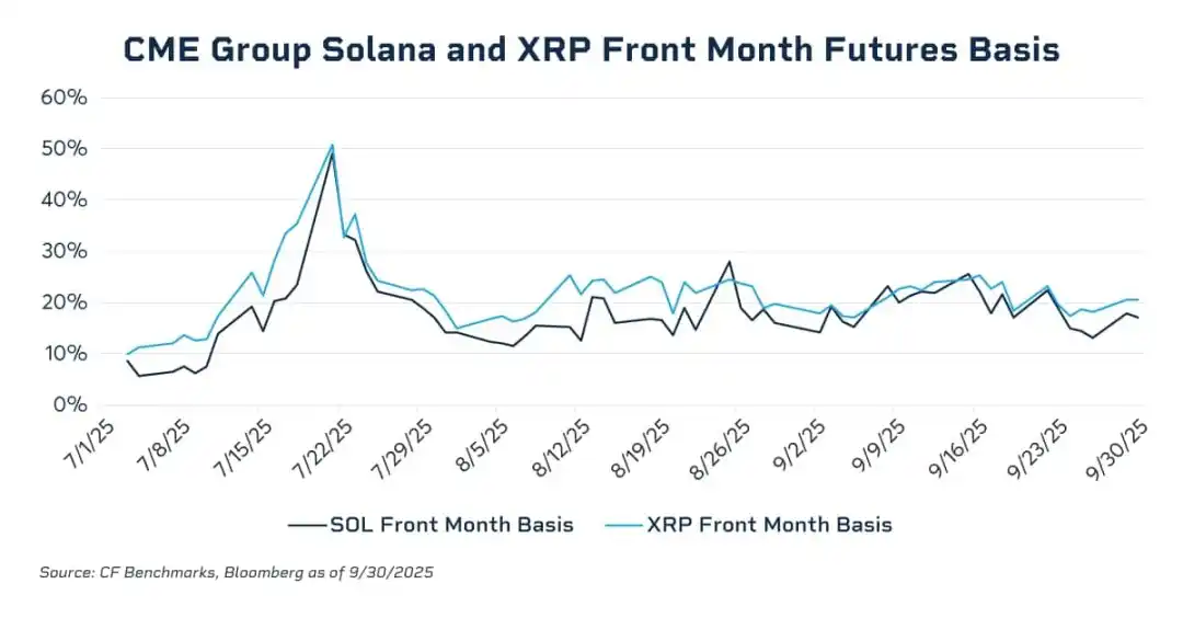 数据显示,前月合约的年化基差在 2024 年 11 月的牛市期间飙升至 20-25% 区间,而在 Q1 的去杠杆化期间则压缩至接近 0。2025 年 7 月,SOL 与 XRP 近月期货合约的年化基差一度飙升至接近 50%,远高于 BTC 期货通常呈现的基差水平,清晰暴露出相关市场缺乏有效的跨市场套利力量。在缺少高流动性、受监管的现货投资工具的情况下,机构资金难以规模化部署期货空头 / 现货多头的现金与套利结构,自然也无法对过高的基差溢价形成持续压制。随着 SOL 与 XRP 现货 ETF 在通用上市监管框架下推出,这一结构性空白得到部分填补,为合规机构资本进入市场并通过套利来压缩期货基差提供了必要的现货载体与流动性基础。随着 CFTC 批准现货交易,2026 年极有可能实现现货与期货的保证金互抵。这将释放数十亿美元的闲置资本,极大提升市场的杠杆效率。届时,基差交易的摩擦成本将降至历史最低,基差水平可能会进一步收敛至传统大宗商品水平。
