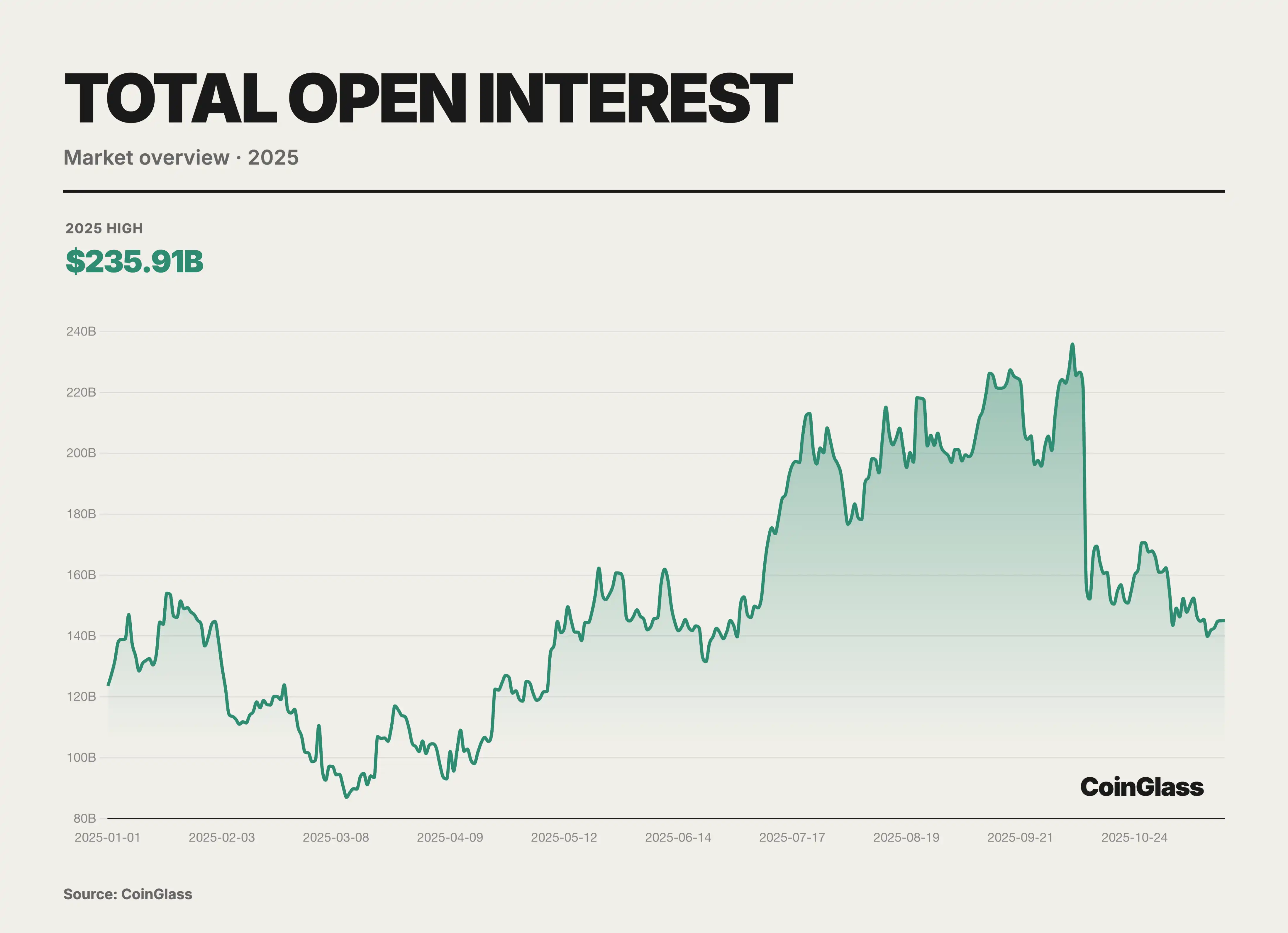 2025 年加密衍生品市场的主线,是从高杠杆零售投机转向机构资本、合规基础设施与链上技术并行演进的再定价。宏观流动性决定趋势,加密在降息预期与风险偏好切换中高 Beta 放大波动,地缘与政策提供触发器;全年去杠杆阶段,10 月外生冲击叠加三季度拥挤杠杆,使全网 OI 自高位两日回撤逾 700 亿美元并出现百亿美元级清算峰值。