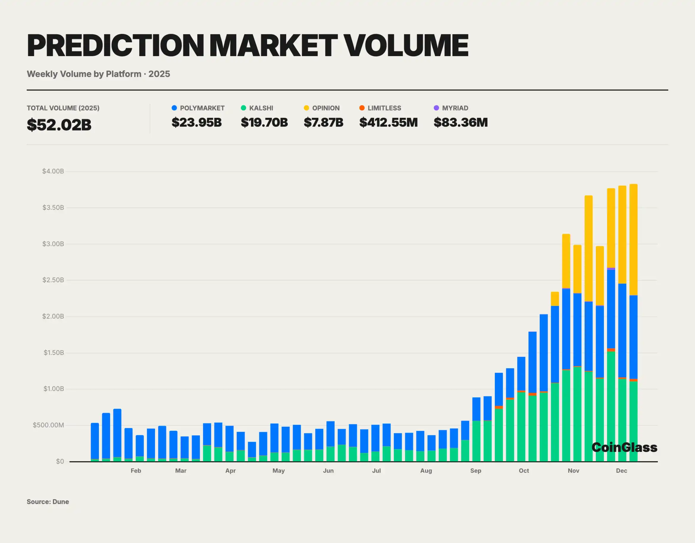 2025 年加密预测市场迎来了爆发式增长,整体交易量在 1 月至 11 月累计达到约 520 亿美元,已大幅超越 2024 年美国大选期间的峰值水平。