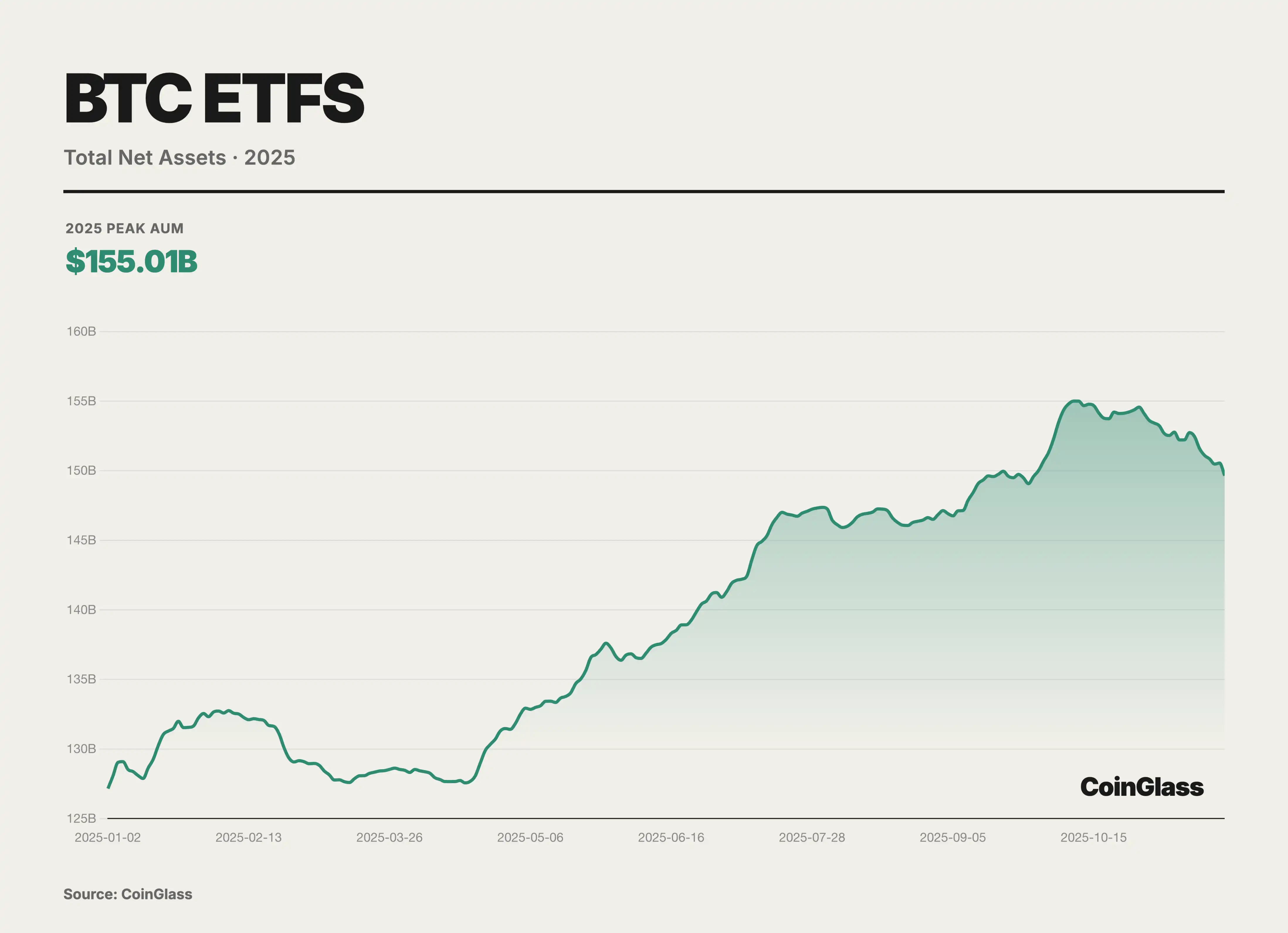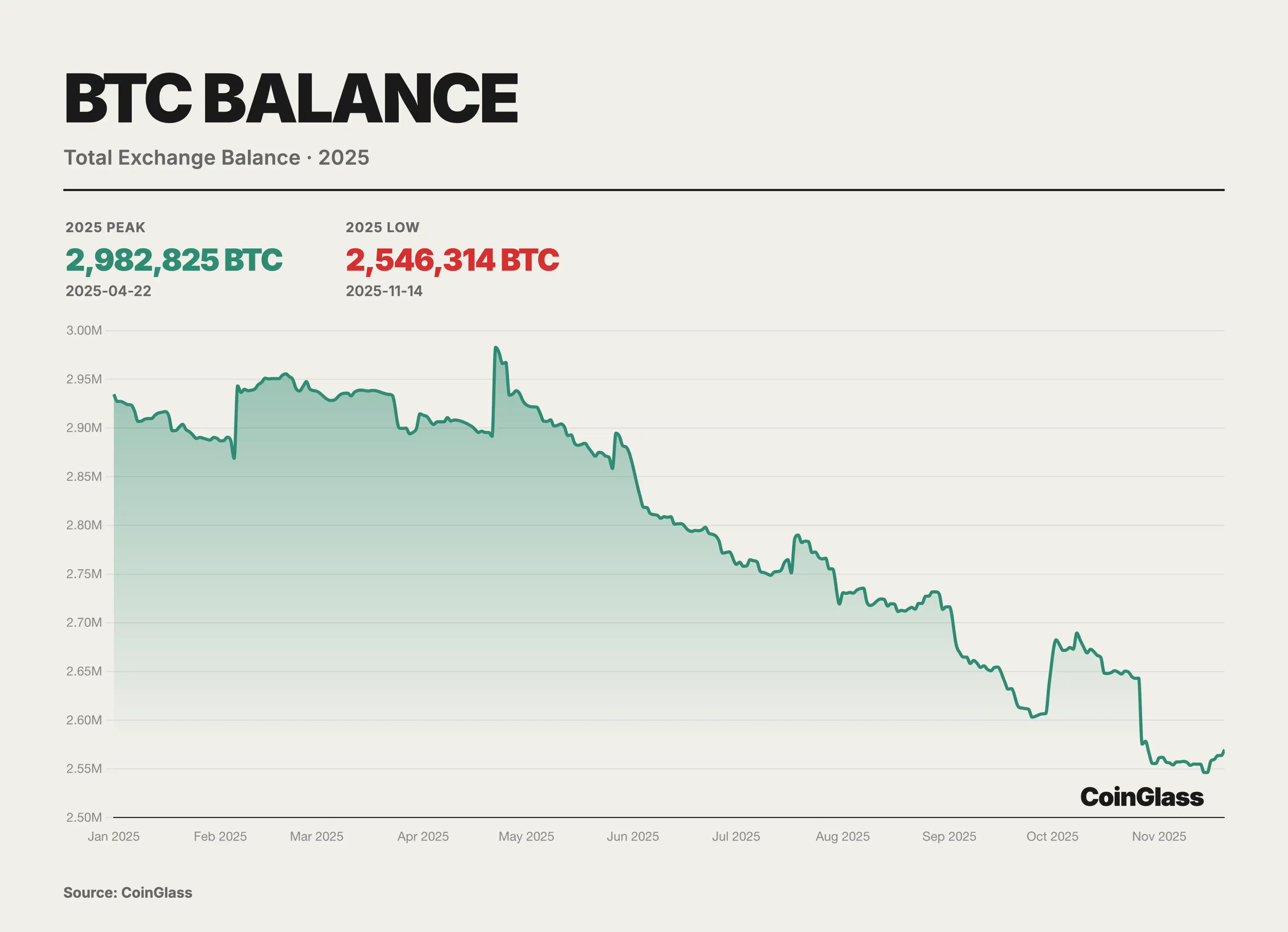 2025 年,BTC 在交易平台层面的供给结构出现了明显再平衡迹象,全网交易平台余额整体呈台阶式下行、从 4 月高点起进入持续去库存阶段。CoinGlass 数据显示,自 4 月 22 日附近触及约 298 万枚的年内峰值后,交易所 BTC 储备在随后数月整体呈阶梯式下行,于 11 月中旬一度下降至约 254 万枚,区间净流出约 43 万枚,降幅约 15%。