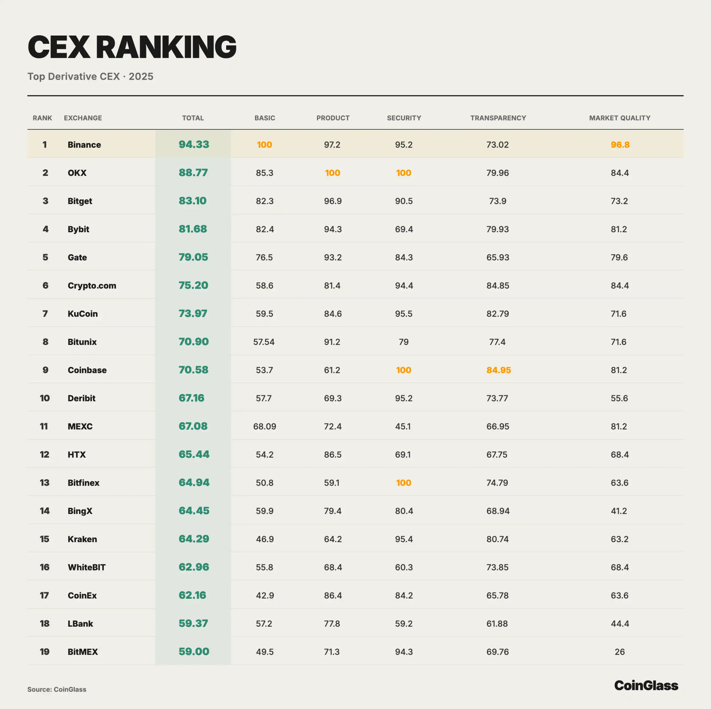 为将衍生品交易在 CEX 侧的头部集中从体量叙事进一步落到可比较的质量维度,CoinGlass 对主要衍生品 CEX 进行了综合评分与排序。下图以基础交易数据为核心权重,并从产品、安全、透明度与市场质量等维度给出分项得分与加权总分,从而直观呈现不同平台在流动性承载、风控约束与信息披露上的结构性差距。