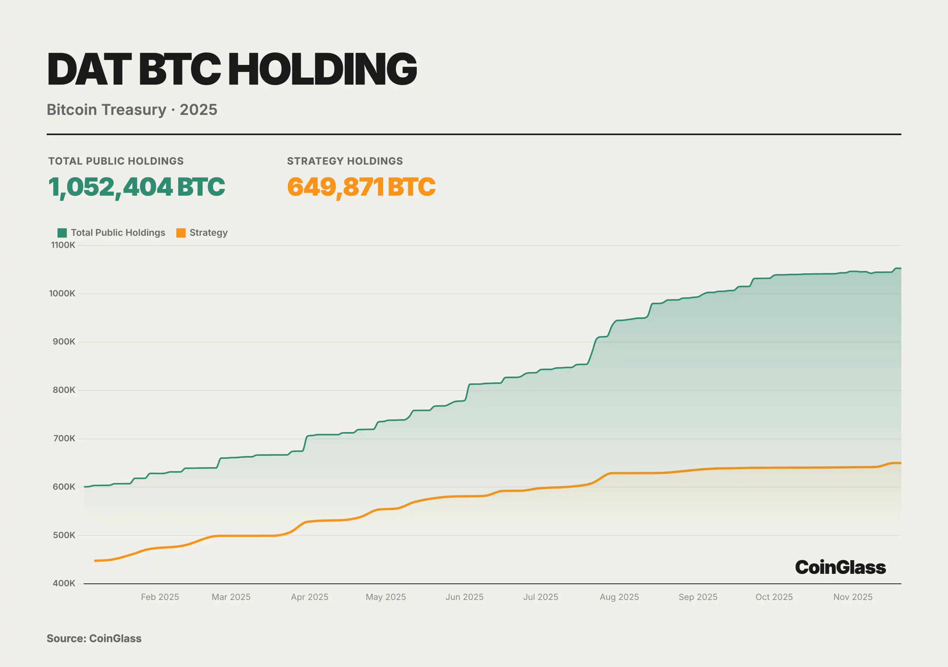 2025 年内,上市公司 DAT 的 BTC 持仓沿着一条几乎单调上升的轨迹,从年初合计约 60 万枚增至 11 月的约 105 万枚,占 BTC 理论总供应量约 5%;其中 Strategy 一家从约 44.7 万枚增持到约 65 万枚,绝对层面仍是无可替代的财库核心,却在市场的占比从约七成滑落到六成出头,增量更多的是来自中小 DAT。