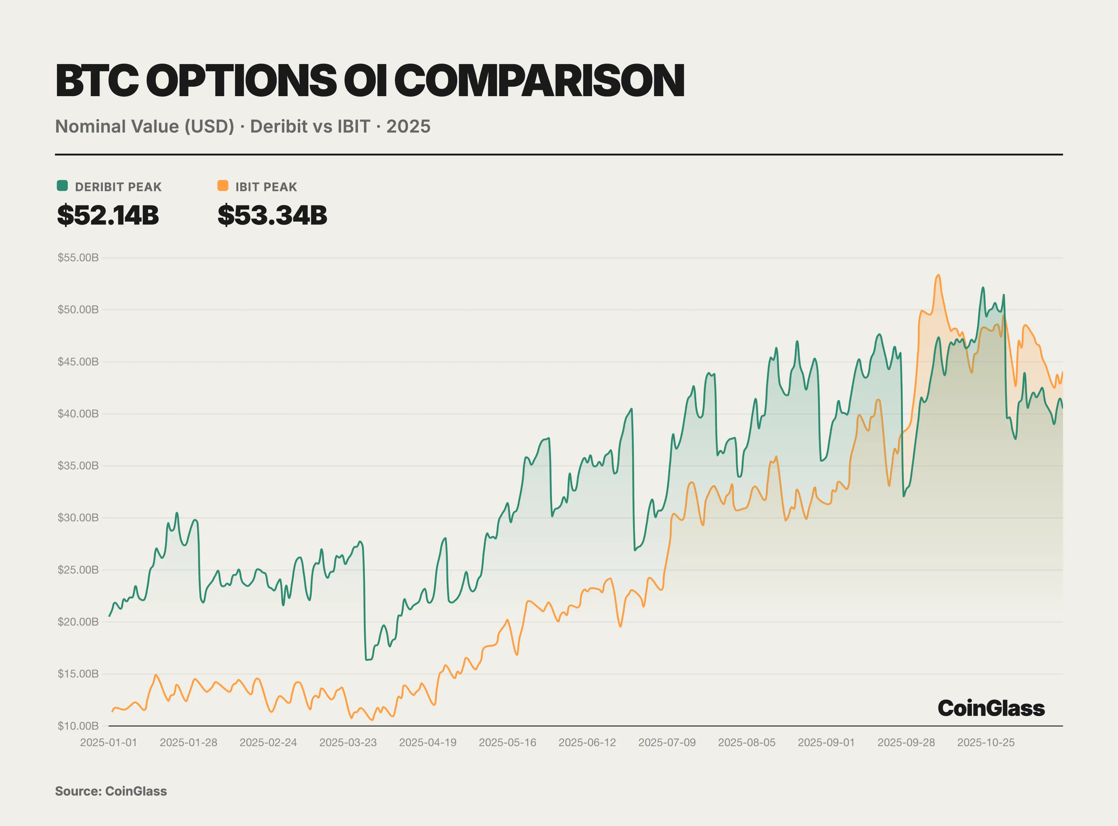 本年度期权市场的核心叙事由两大里程碑事件定义,这两大事件共同重塑了全球数字资产的定价权逻辑。首先是美国最大的合规交易所 Coinbase 以 29 亿美元完成对离岸期权巨头 Deribit 的收购,这一并购案不仅标志着传统合规交易所对原生加密流动性的整合,也重新定义了全球衍生品交易的基础设施格局。其次,BlackRock 旗下 IBIT ETF 期权的崛起,并在 2025 年第三季度末在持仓量上首次超越长期霸主 Deribit,标志着传统金融资本已正式在波动率定价权上与加密原生平台分庭抗礼。在此之前,Deribit 一直享有近乎垄断的优势,截至 2024 年底,Deribit 控制着约 85% 的全球加密期权市场份额。
