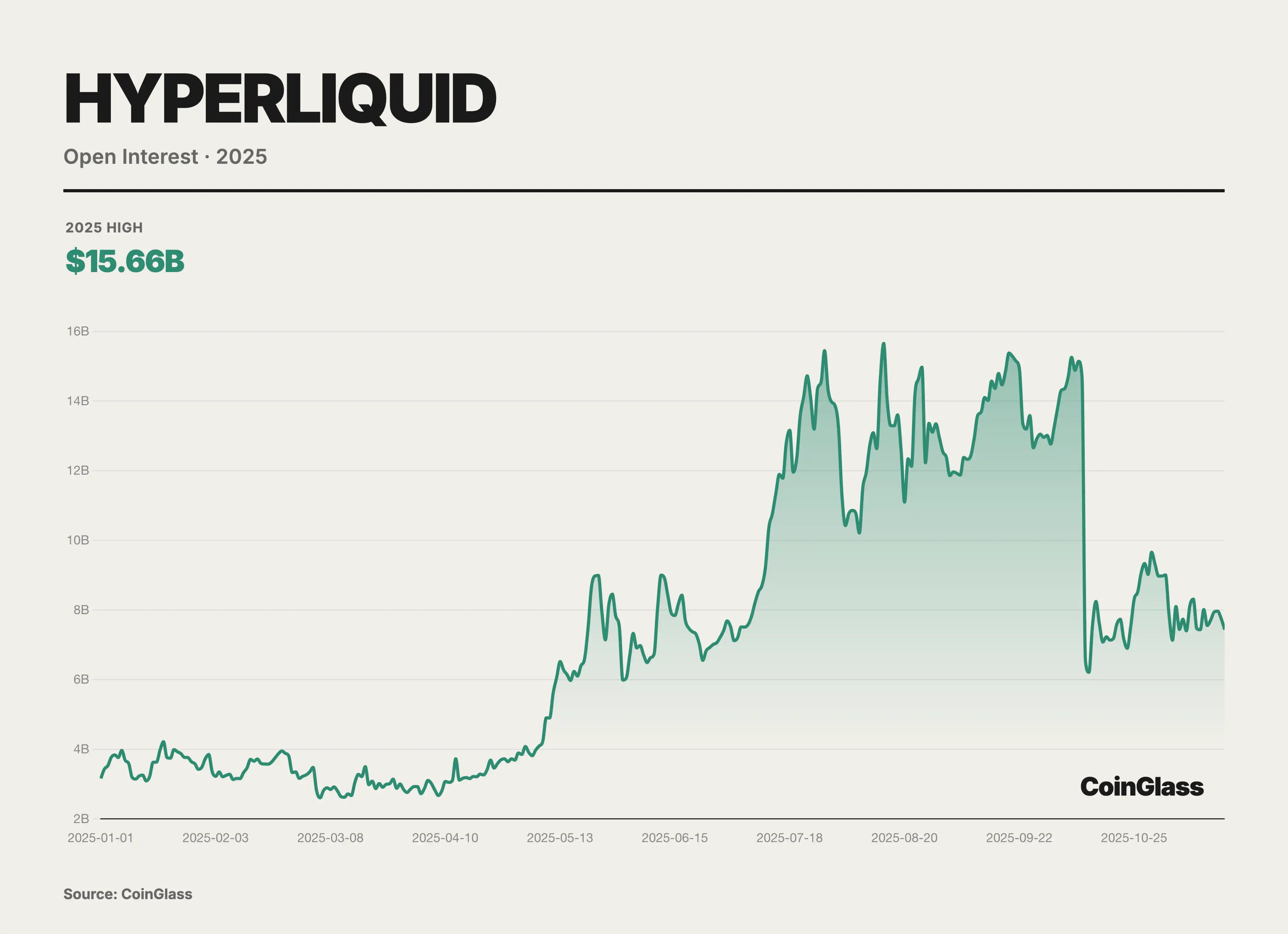 Hyperliquid 不仅吸引了海量交易量,也积累了巨额的未平仓合约规模。2025 年 10 月数据显示,其持有的永续合约未平仓价值达到 150 亿美元,占主要去中心化永续平台总持仓的约 63%。这一指标表明,大量资金选择在 Hyperliquid 上长期驻留,反映出交易者对该平台流动性和稳定性的高度信任。