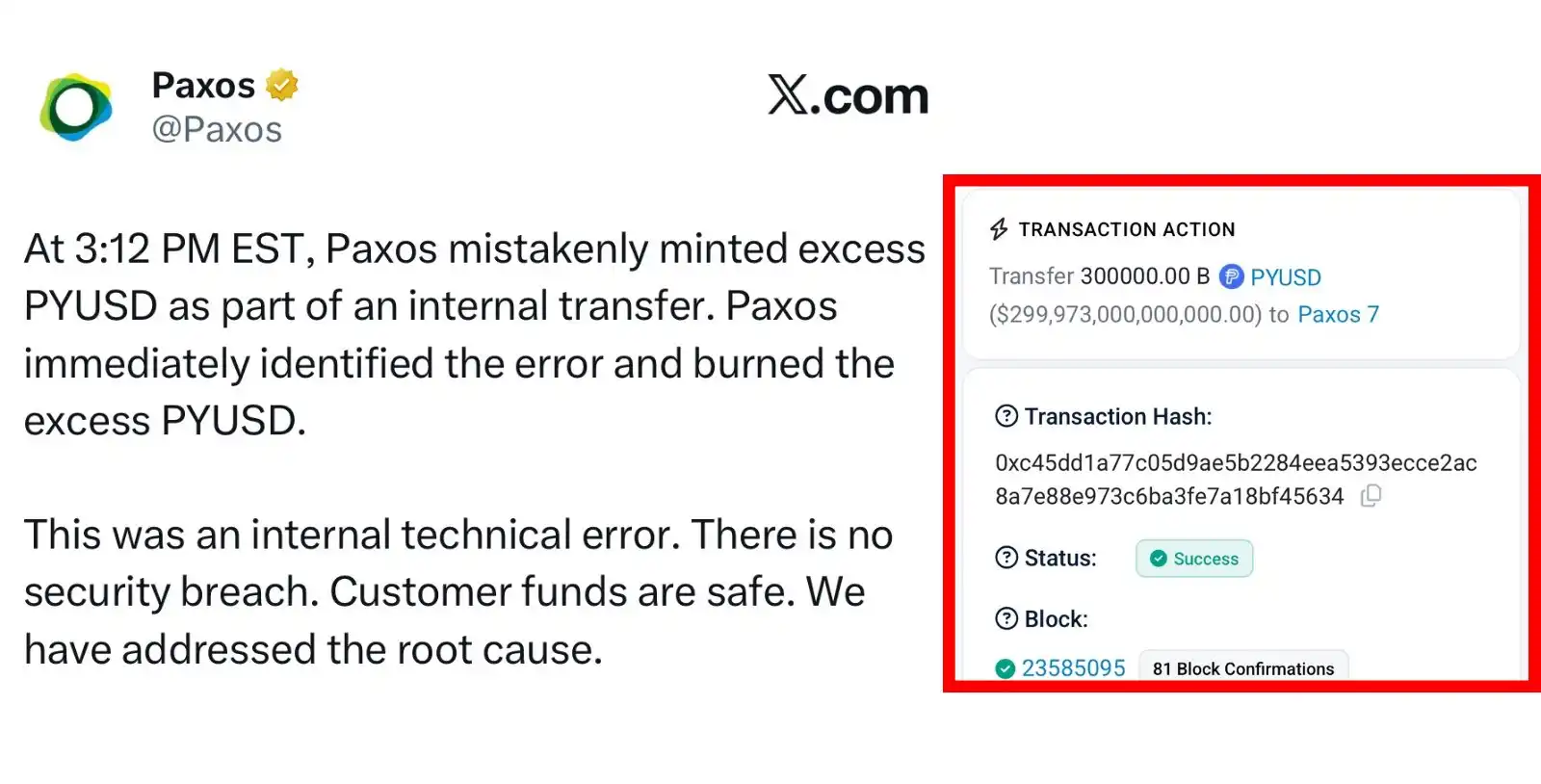 10 月,稳定币发行商 Paxos 铸造了 300 万亿枚与美元 1:1 锚定的 PYUSD 稳定币,发现出错后,花了 22 分钟将全部代币销毁。