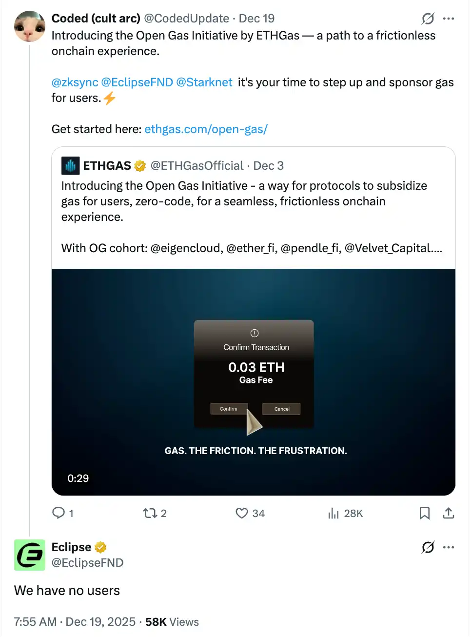 Eclipse 这个项目自成立以来就出现过多次引发社区关注的事件,不管是创始人陷入性侵丑闻还是中途多次更换领导层和 CEO。前不久,Eclipse 还在社交媒体上发帖称 Eclipse 是哈佛大学开展的一项为期 36 个月的社会学研究。「我们的研究现已完成。感谢您抽出时间配合。」这不,又整上活来,在一条介绍新项目 ETHGAS 的帖子下面,Eclipse 官方账户直言,我们没有用户。