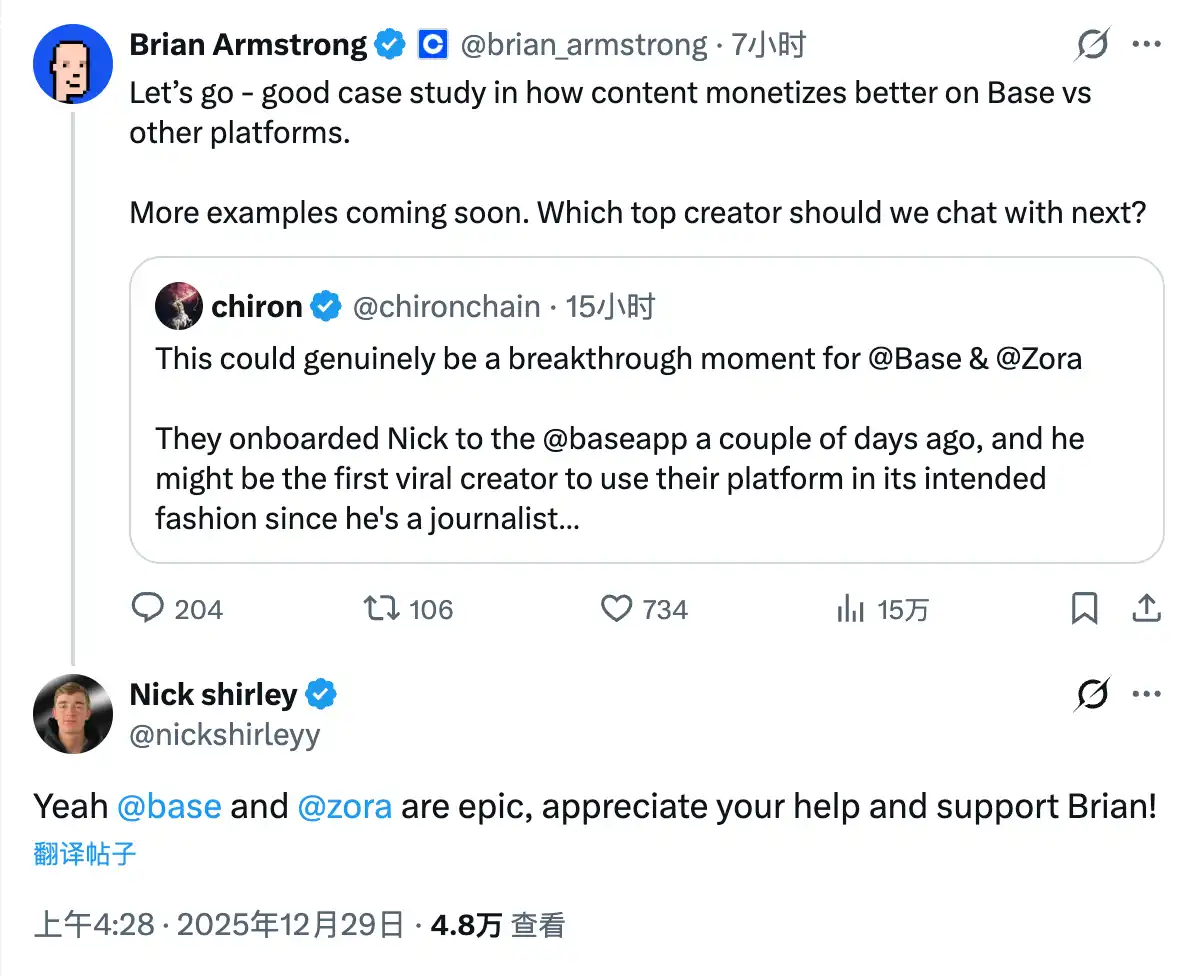 Brian Armstrong 就此表示,这证明内容在 Base 上的变现效果优于其他平台,而 Nick Shirley 也没忘了在赚钱后感谢了 Brian Armstrong,并称赞 Base 和 Zora 为「传奇」。