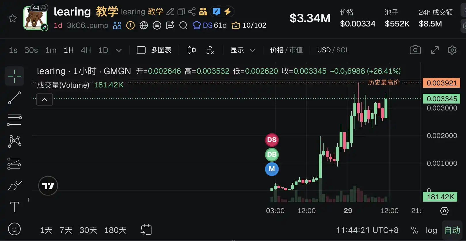 首先是社区自发围绕着本次调查中最抽象的那个错误拼写 learing 进行了炒作,在 Solana 链上该 Meme 代币市值暂报 334 万美元。