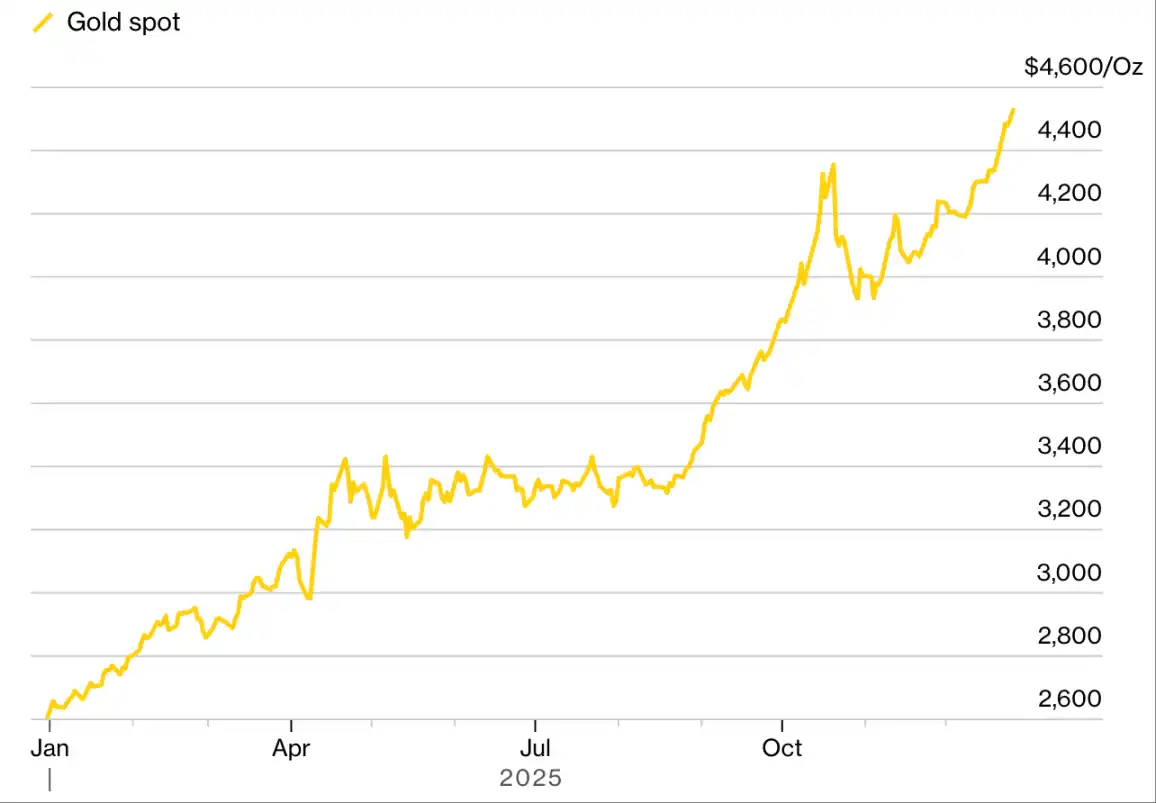 其他资产的价格走势则呈现分化:铜、铝甚至白银等金属的波动,一半源于「对货币贬值的担忧」,另一半则受特朗普关税政策和宏观力量驱动,这模糊了「通胀对冲」与「传统供应冲击」的界限。与此同时,黄金持续走强,不断刷新历史新高。在这一领域,「贬值交易」依然有效——但它不再是对「法定货币的全面否定」,更多是对「利率、政策与避险需求」的精准押注。