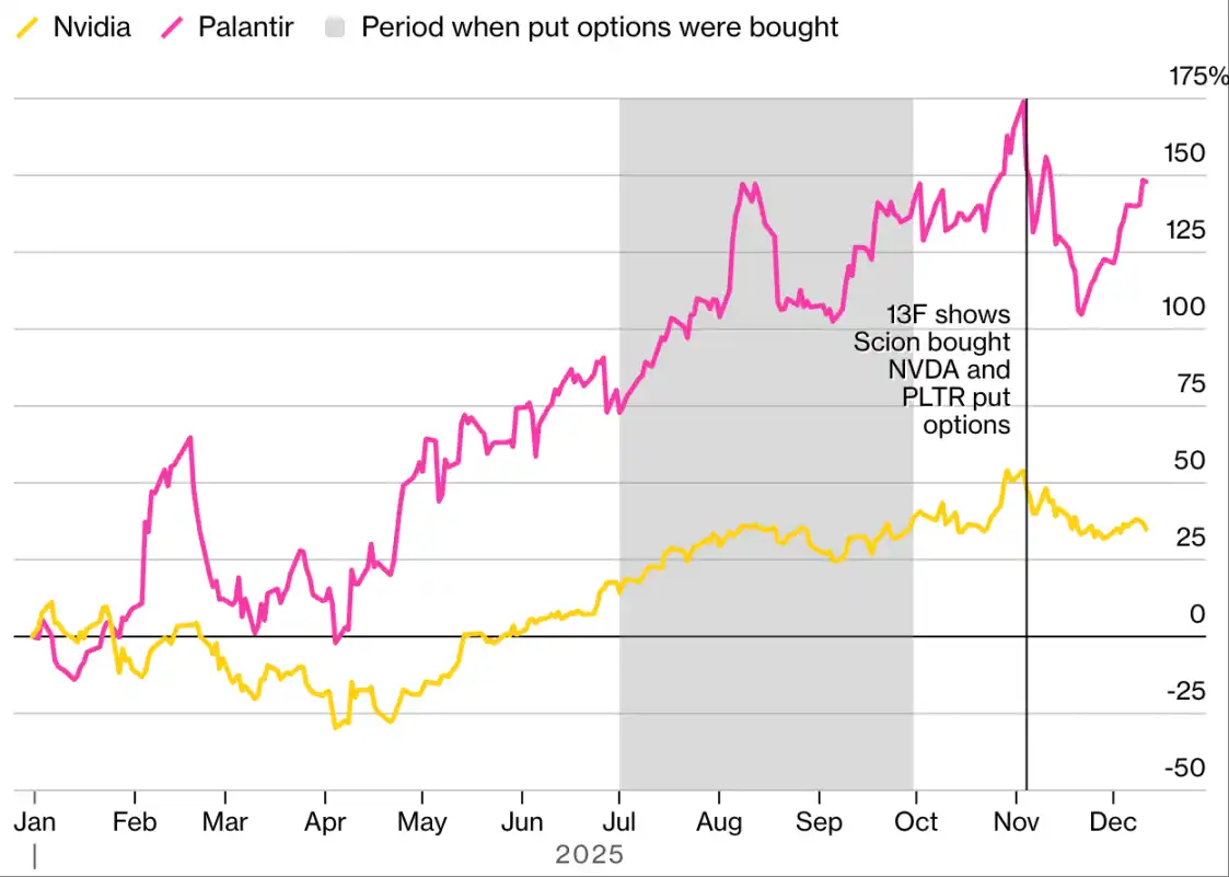 期权的行权价令人震惊:英伟达的行权价比披露时的收盘价低 47%,帕兰提尔的行权价更是低 76%。但谜团仍未解开:受限于「有限的披露要求」,外界无法确定这些看跌期权(赋予投资者「在特定日期前以特定价格卖出股票」权利的合约)是否属于更复杂交易的一部分;且文件仅反映 9 月 30 日赛昂的持仓情况,无法排除伯里此后减持或清仓的可能。