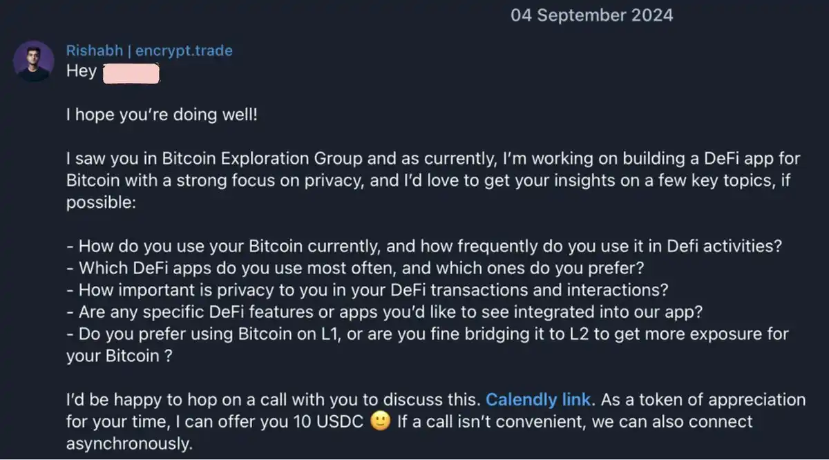 事实上,冷私信本身也是一个需要不断迭代的过程。在撰写和发送冷 DM 时,有几个关键点需要注意:尽量以一个相对「温和」的开场开始、把最有分量的信息放在前面(例如融资情况、处理过的交易量等)、说明你是在哪里看到或了解到对方的、保持一个友好、不具侵入性的行动引导(CTA)、一定要跟进,不要只发一次就结束