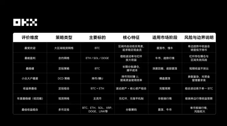 本报告将从 OKX 交易所策略产品、赚币产品、交易币种和实际收益表现等数据维度,拆解 2025 年交易所用户的真实选择,揭示哪些操作长期有效,哪些只是“看起来很赚钱”。当叙事噪音被剥离,CEX 的年度趋势,反而比想象中更加清晰和具体。鉴于交易数据与市场信息本身具有高度透明性和个体差异,相关细节不再逐一展开,可自行查阅。本文不聚焦具体交易结果,而侧重于策略层面的思路拆解,提供简单、可行、可参考的策略模型,供读者结合自身情况理解与应用。