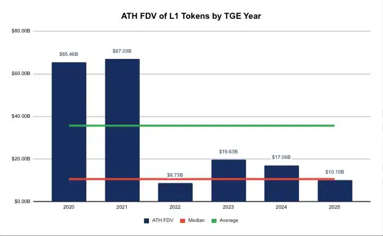 各年度 TGE 的 Layer1 代币历史最高完全稀释估值(ATH FDV)统计。