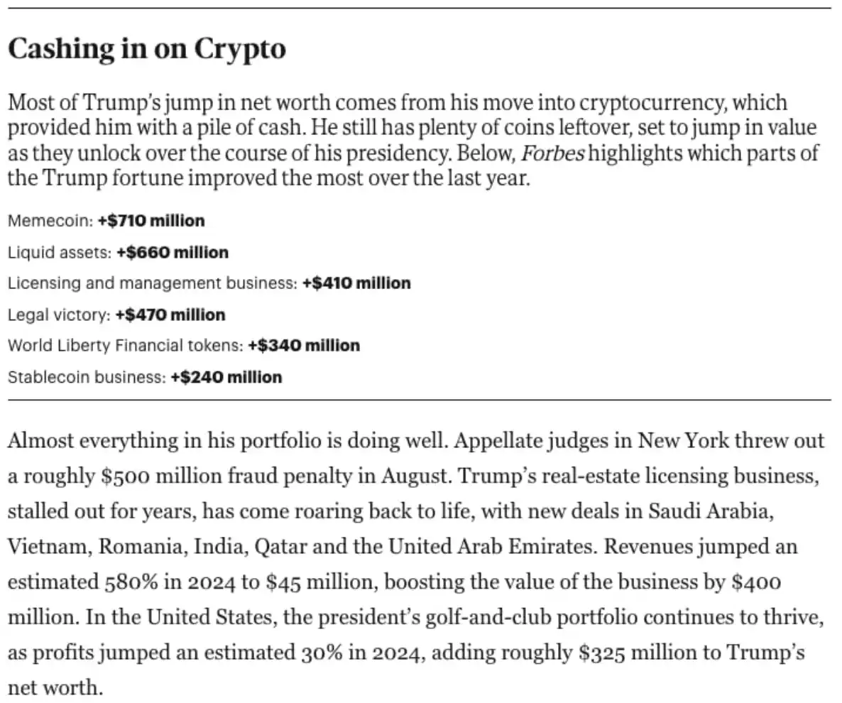 Forbes 报道,总统任期使得特朗普的净资产在一年内增加了 30 亿美元。