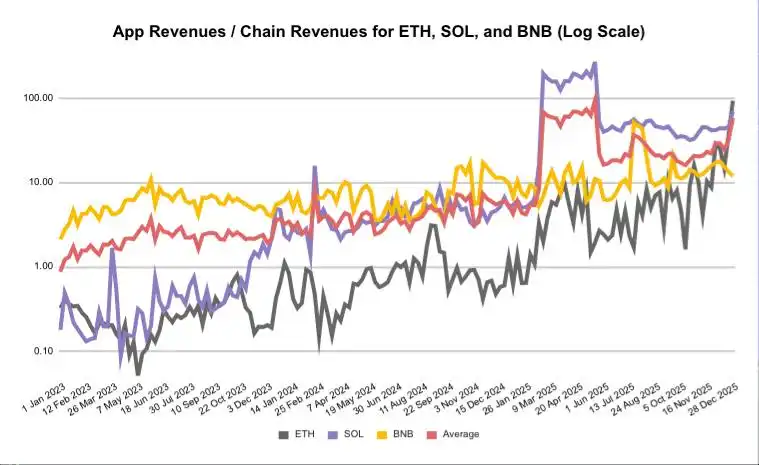 ETH、SOL 与 BNB 的应用收入 / 链层收入对比。