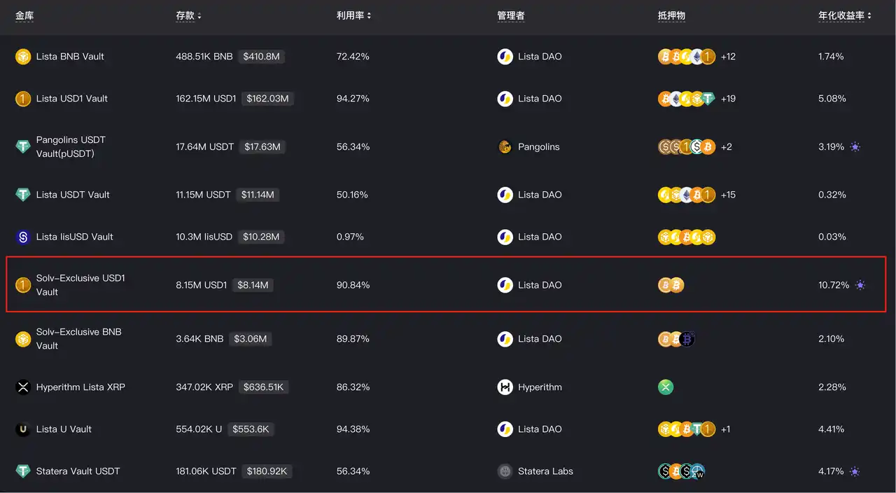 · 路径选择: 将借出的稳定币存入 Solv 独家 USD1 Vault,该金库提供了高达 10% 的 APY。