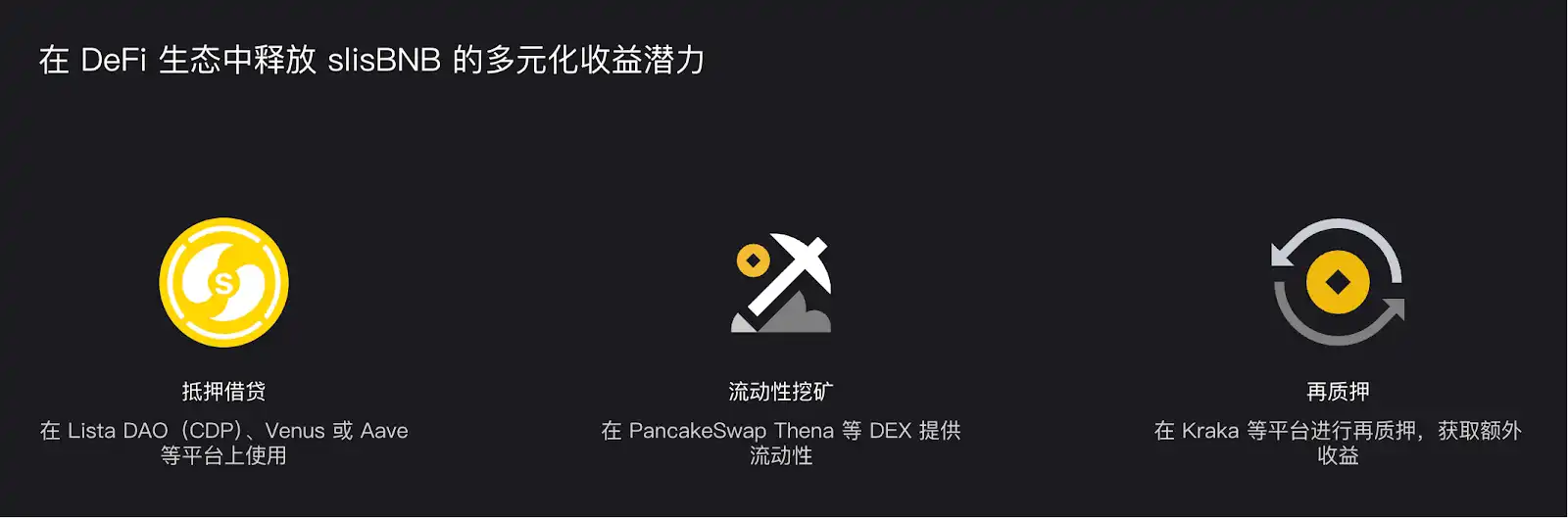 · 质押: 将手中的 BNB 质押为 slisBNB。