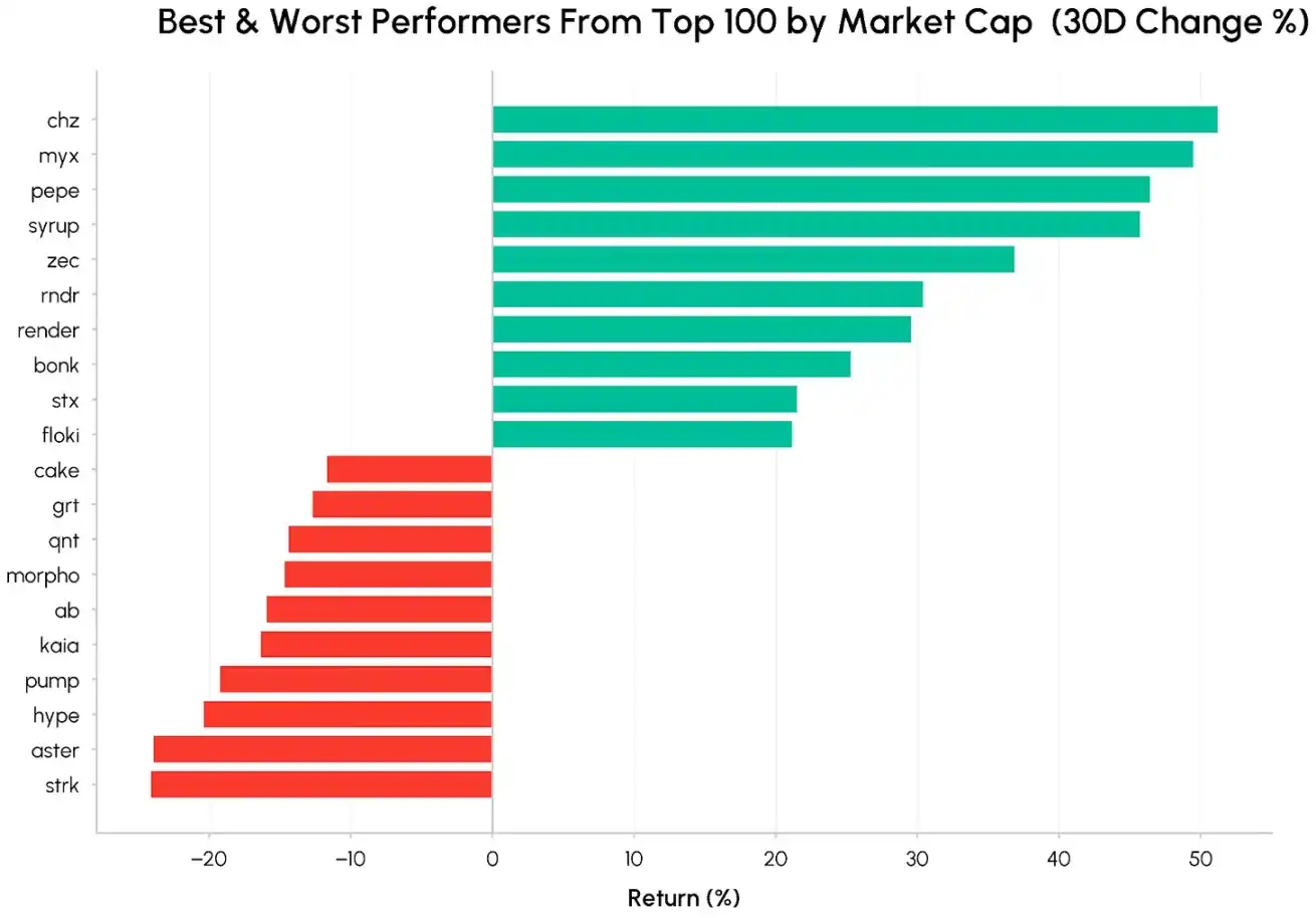 过去一个月,表现亮眼的币种包括 PEPE、BONK 等 Memecoin,主打隐私保护的 Zcash(ZEC),以及机构信贷平台 Maple Finance(SYRUP)。这一现象表明,市场对于 Memecoin、隐私类币种,以及具备明确收益分成机制和可见现金流增长的 DeFi 代币的兴趣正在回升。