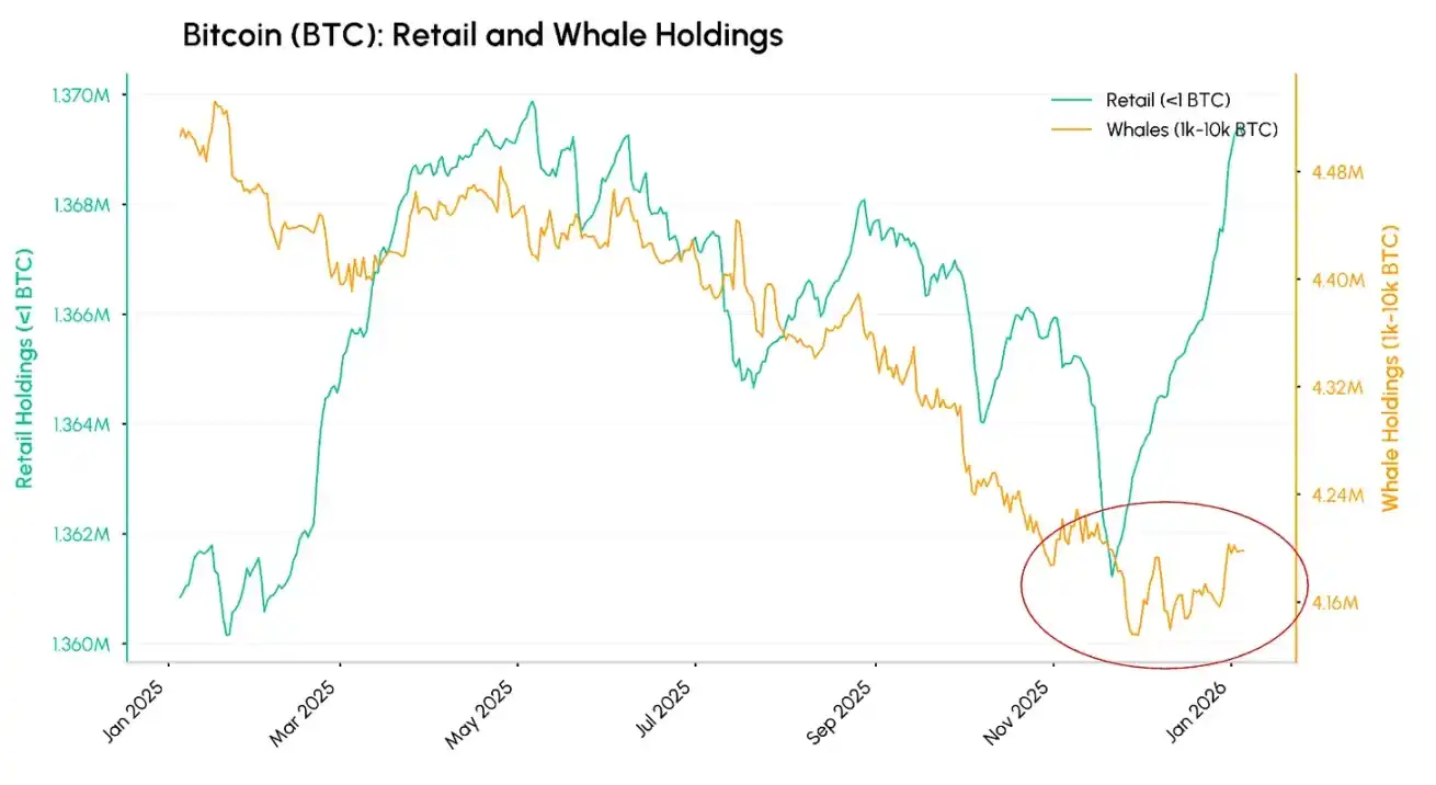 链上数据显示,进入 1 月以来,持有 1,000-10,000 枚比特币的巨鲸钱包的代币抛售行为明显收敛,这意味着来自这一群体的抛压正在减弱。与此同时,持仓量不足 1 枚比特币的散户投资者,自去年 11 月中旬以来一直在加速增持。随着加密货币价格从高位回落并盘整,散户正逢低布局。巨鲸抛售减少叠加散户持续买入,共同构筑了市场的有利格局。