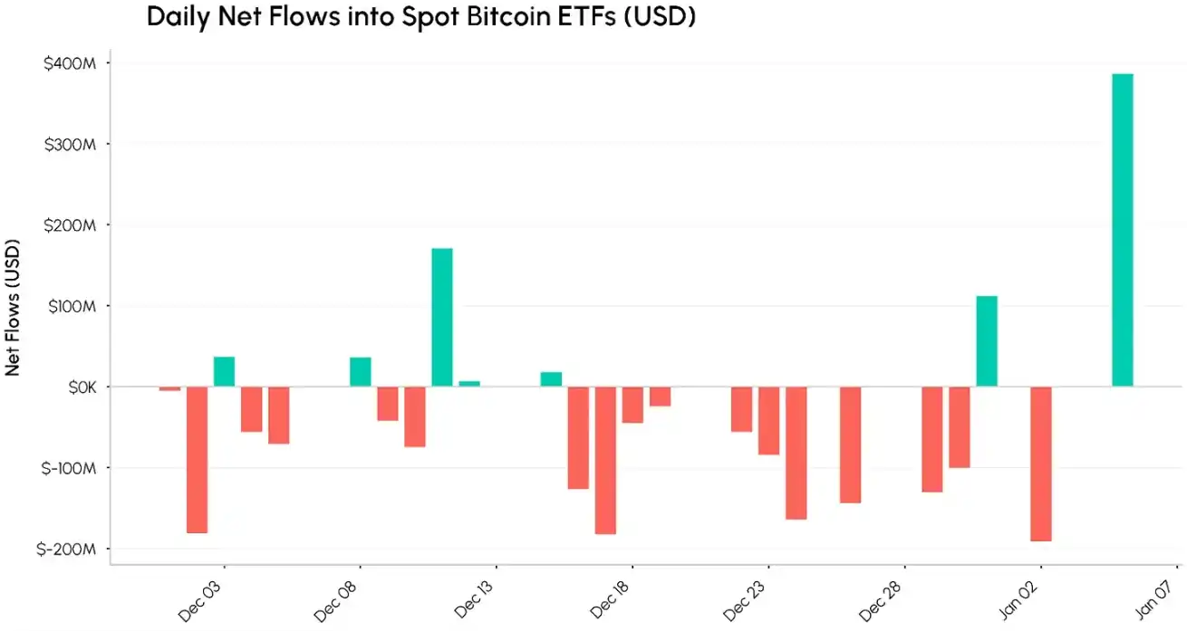 · 现货比特币 ETF 在 1 月 5 日扭转了年底的资金外流趋势,净流入约 4 亿美元;巨鲸出货行为有所收敛,散户则在积极增持筹码。