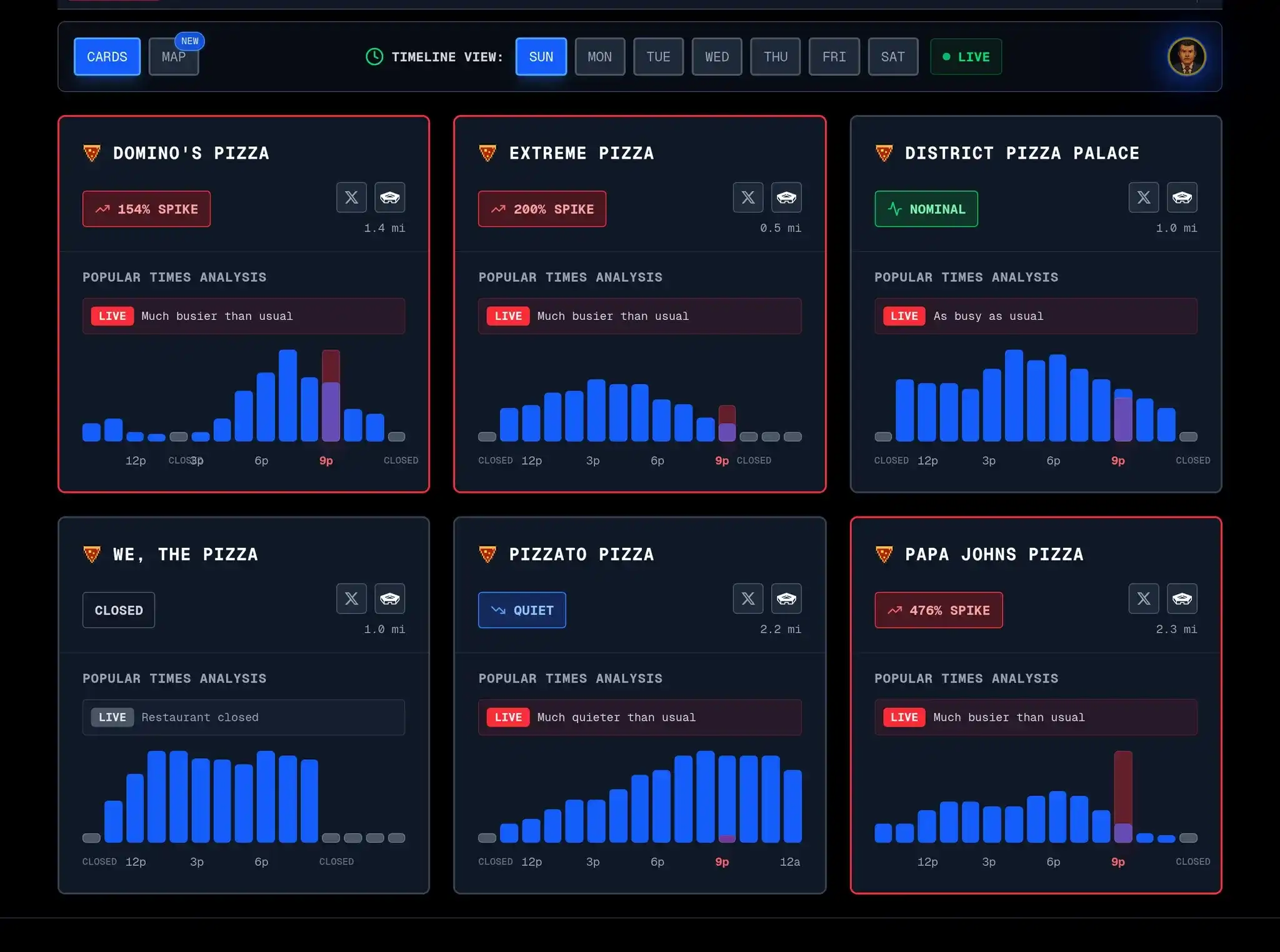 如今,网上已经有专门的网站实时监控五角大楼附近的六个披萨店,包括 Papa John's 和达美乐等。今天,这个网站上全都在显示疯狂的倍数,从 150%-1250% 不等。
