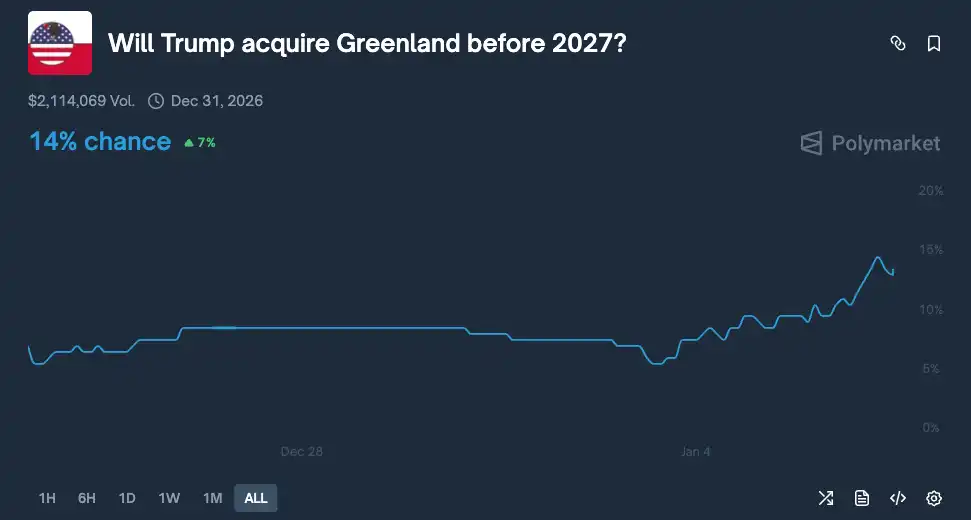 在 Polymarket 上,「特朗普 2027 年前收购格陵兰岛」的市场敏感度很高。该市场概率从 12 月 28 日的约 7% 上升至目前的 14%,涨幅达 7 个百分点,交易量突破 210 万美元。这一上涨时间点也与委内瑞拉行动重合。