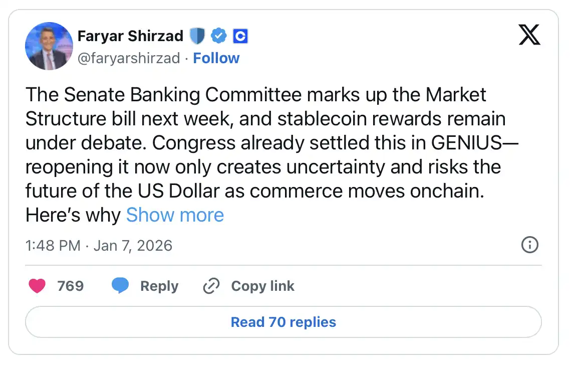 相比之下,加密行业则将银行业的相关努力描绘为试图推翻《GENIUS 法案》中已经达成的共识。Coinbase 首席政策官 Faryar Shirzad 近日在 X 平台发文称,保留与稳定币挂钩的奖励机制,对于维护美元的主导地位至关重要;他还指出,中国近期已宣布计划为其央行数字货币,即数字人民币,开始支付利息。