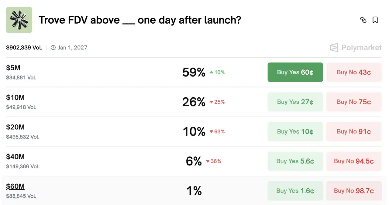Trove 将在北京时间 1 月 20 日 1 点 TGE,Polymarket 的盘口数据显示,以预售估值计算,TROVE 代币有 90% 的概率破发。