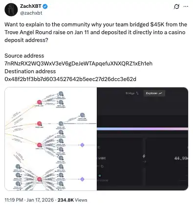 知名链上侦探 ZachXBT 披露,Trove 团队向 @TJRTrades 支付了高达 4.5 万美元的营销费用,并直接打入该 KOL 的菠菜网站充值地址