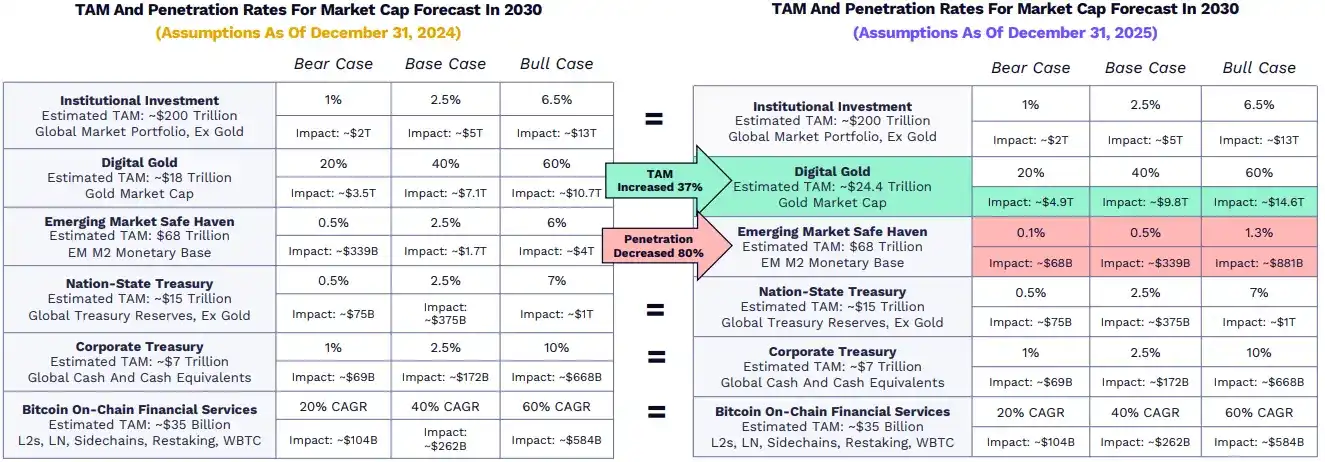 ARK 对 2030 年比特币的预测一直相当稳定,只是有两个假设因素发生了变化:作为数字黄金,在 2025 年黄金市值飙升 64.5% 后,其潜在市场(TAM)增长了 37%;作为新兴市场避险资产,其预测渗透率下降了 80%,以反映发展中国家对稳定币的迅速采用。
