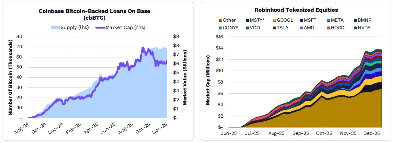 传统企业正通过构建自有基础设施来扩大其在链上的影响力。传统企业正在构建其自有的链上基础设施。Circle(Arc)、Coinbase(Base,cbBTC)、Kraken(Ink)、OKX(X Layer)、Robinhood(Robinhood Chain)和 Stripe(Tempo)正在推出公司自有品牌的 L1/L2 网络,以支持其自身产品,例如比特币抵押贷款、代币化股票和 ETF,以及基于稳定币的支付渠道。