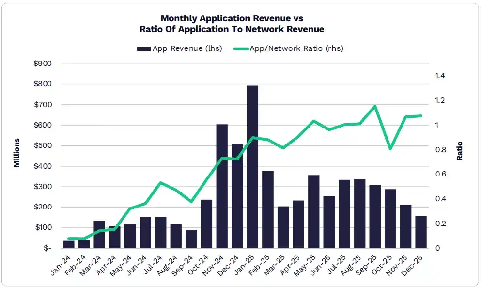 2025 年所有应用收入的五分之一都来自 1 月份,这是有史以来最高的月度收入。如今,已有 70 个应用程序和协议的月度经常性收入 (MRR) 超过 100 万美元。
