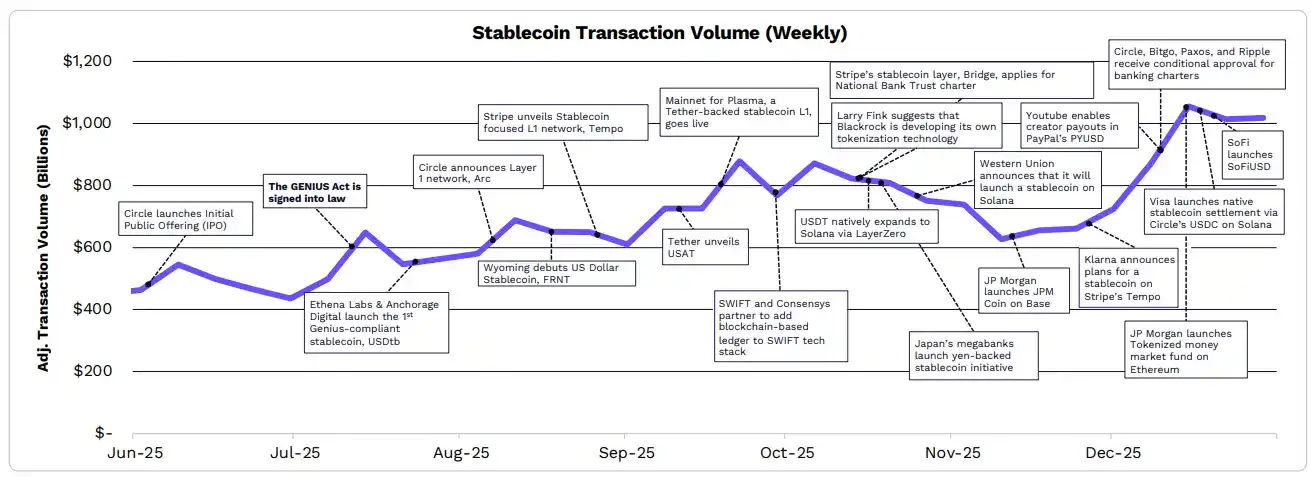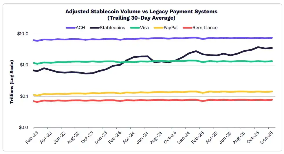 · 2025 年 12 月,稳定币交易量 30 天移动平均值为 3.5 万亿美元,是 Visa、PayPal 和汇款(Remittances)总值的 2.3 倍。