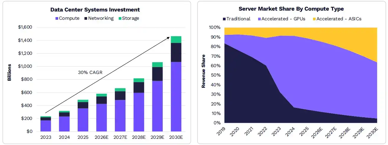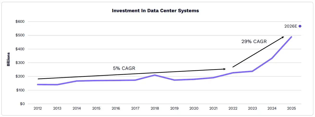 自「ChatGPT 时刻」以来,数据中心系统的增长速度已从 5% 加速至 29%,年增长率持续攀升。