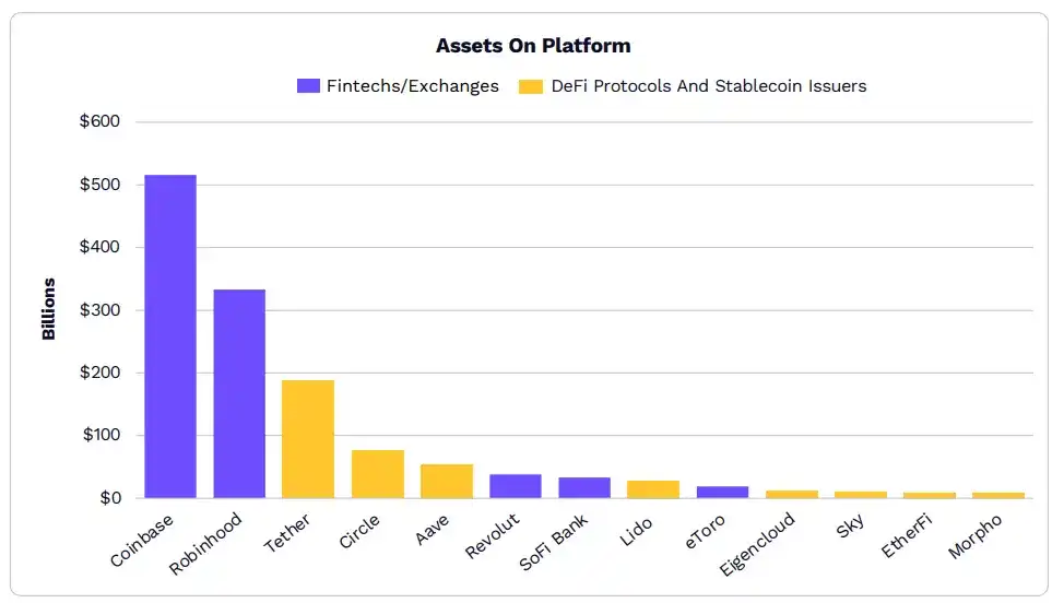 DeFi 和稳定币发行商的资产规模正在赶上许多金融科技公司。传统金融科技平台和加密原生平台之间的资产规模差距正在缩小,这表明传统和链上基础设施正在融合。流动性质押或借贷平台等 DeFi 协议正在吸引机构资本并迅速扩张。