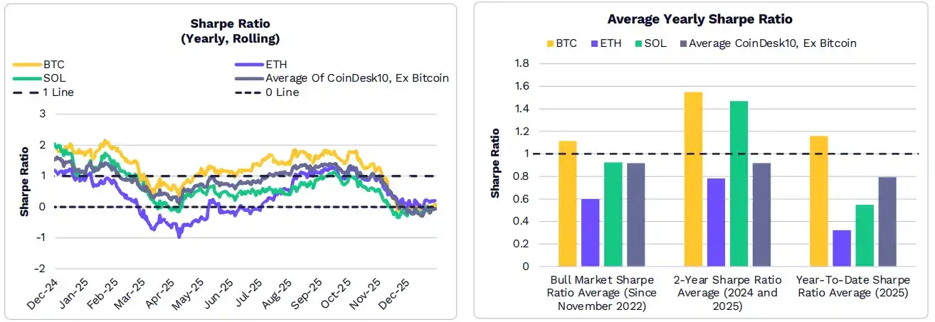 2025 年的大部分时间里,比特币的风险调整后收益超过了大多数其他市值较大的加密货币和指数。自最近一轮周期低点(2022 年 11 月)、2024 年初以及 2025 年初以来,比特币的平均年化夏普比率也超过了以太坊、SOL 以及 CoinDesk 10 指数中其他九种成分币的平均值。