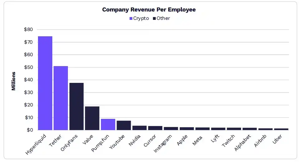 全球最具营收效率的公司包括 Hyperliquid、Tether 和 Pump.fun。到 2025 年,Hyperliquid 仅凭 15 名员工,就创造了超过 8 亿美元的年收入。通过永续合约、稳定币和模因币等链上垂直领域的布局,Hyperliquid 正以惊人的规模吸引用户和资本,并拥有清晰的产品市场契合度。